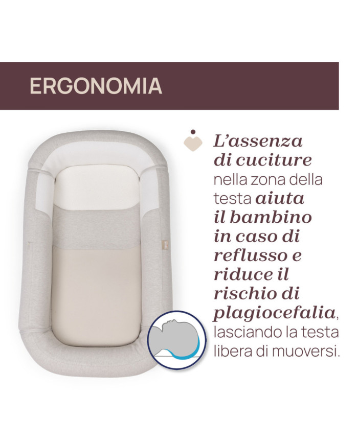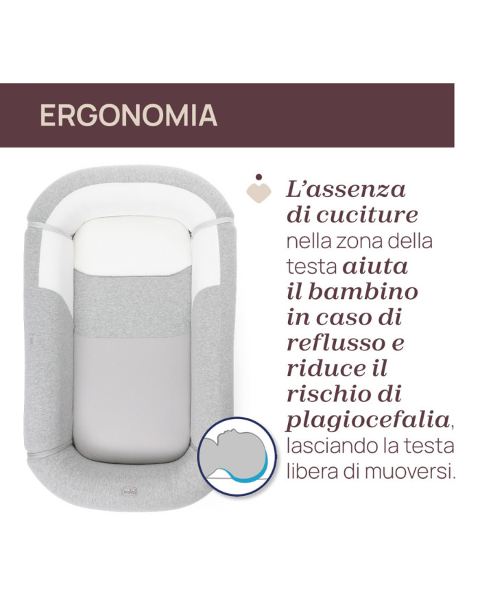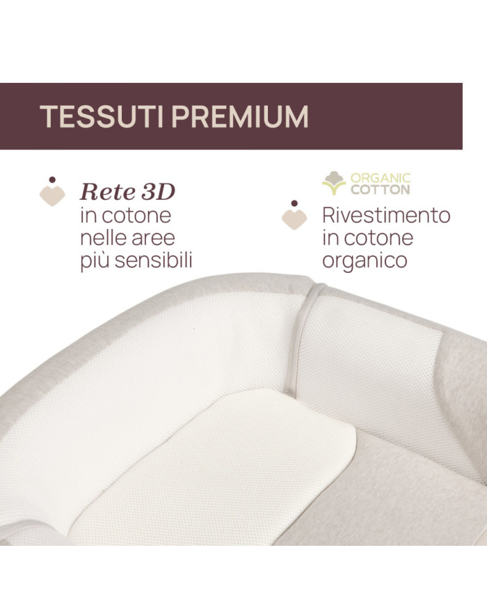 Realizzato in cotone biologico con rete 3D traspirante, garantisce comfort, sicurezza e freschezza in ogni fase della crescita.