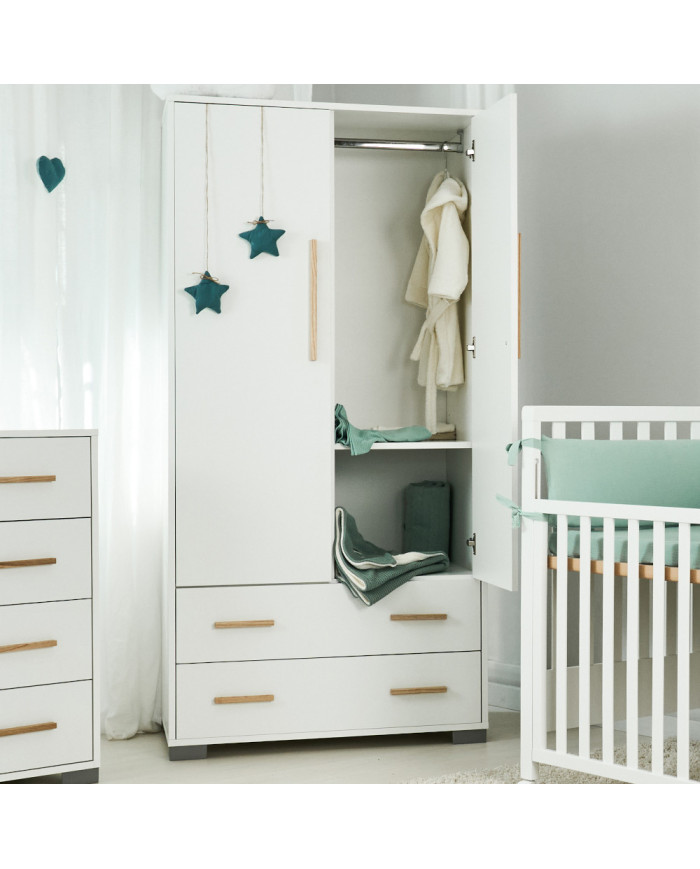 L’Armadio Dreamy 2 ante Coccolissimi con maniglie in rovere è il mobile perfetto per la cameretta: solido, capiente e funzionale, dotato di 2 ante a chiusura rallentata, 3 mensole regolabili e 2 ampi cassetti. Le eleganti maniglie in rovere donano un tocco di stile e modernità.