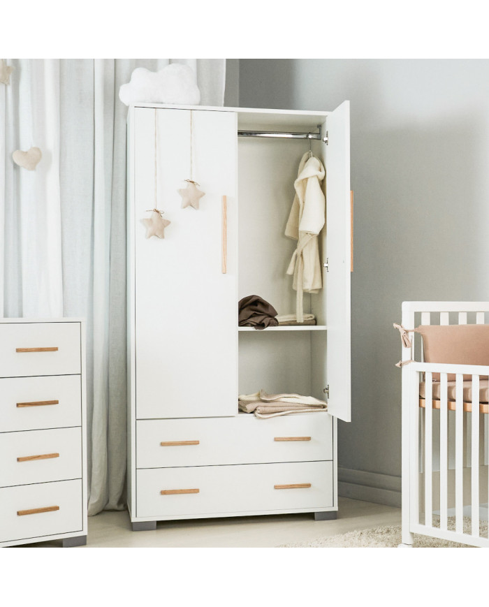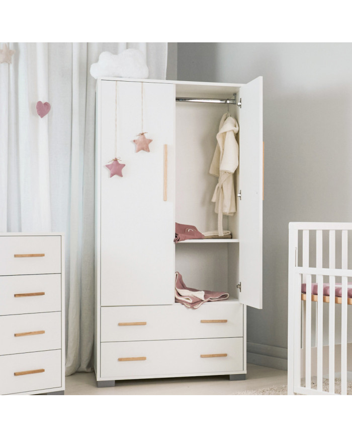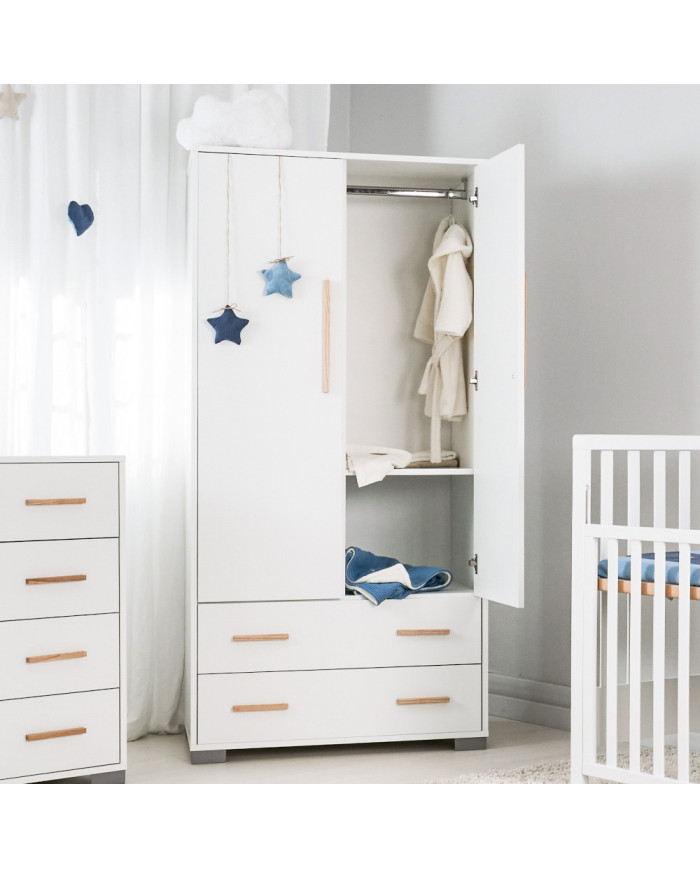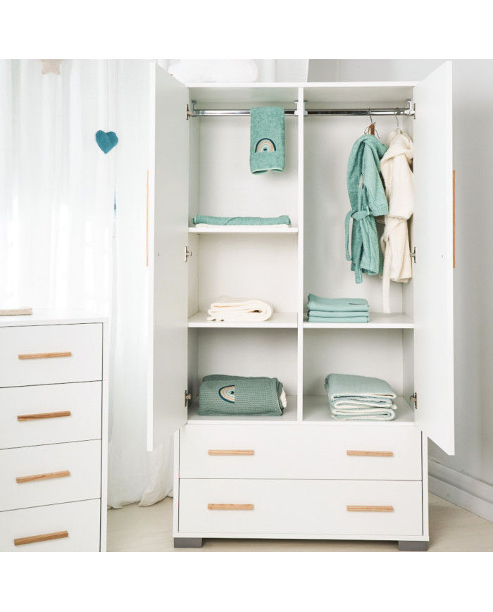 L'Armadio Dreamy 2 ante Coccolissimi con maniglie in rovere è progettato per garantire ordine e funzionalità in cameretta. Grazie alla distribuzione ottimale degli spazi interni, offre tutto ciò che serve: due ante con chiusura rallentata, tre mensole regolabili, una barra appendiabiti e due cassetti capienti ad alto scorrimento.