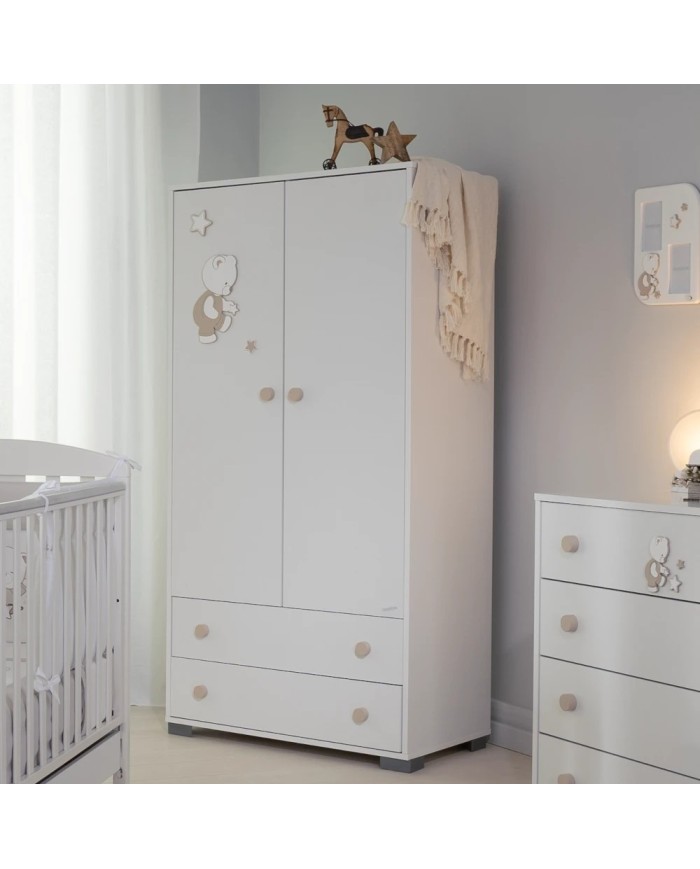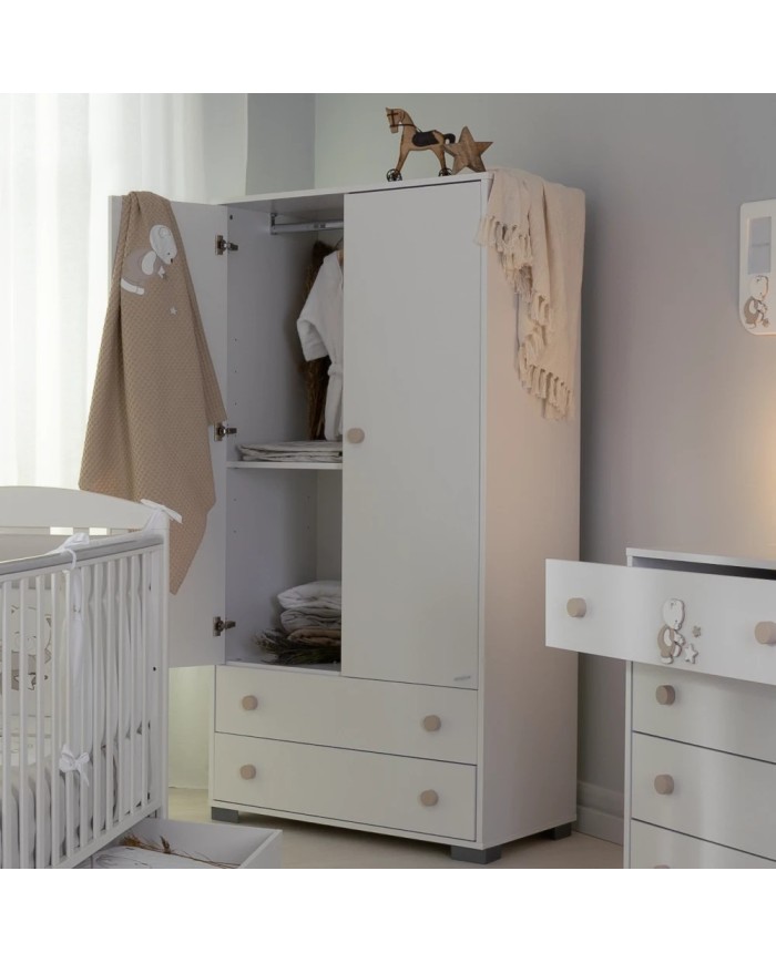 Adatta per tutte le fasi della crescita del tuo bambino, quella dell'Armadio Quadro Cercatore di stelle di Coccolissimi è la soluzione più solida e capiente che ci sia. Con i suoi spazi distribuiti in modo sapiente ti permetterà di appendere e riporre al suo interno abbigliamento, biancheria e molto altro. La struttura si compone di 2 vani superiori (con ante, barra appendiabiti e 3 mensole posizionabili a piacere) e due ampi cassetti alla base.
