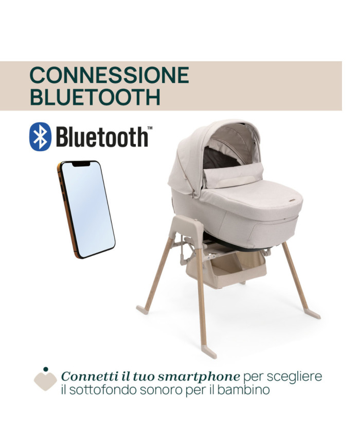Puoi fissare la navicella con un solo gesto e scegliere tra 5 rumori bianchi integrati o collegare il tuo smartphone via Bluetooth per riprodurre la musica preferita del tuo bebè.