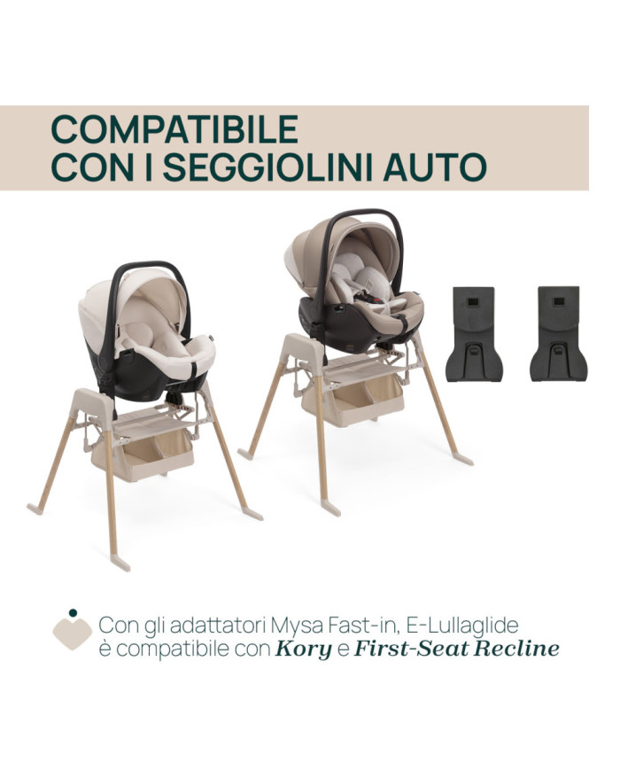Sì, è compatibile con le navicelle e le sedute Mysa e Bellagio senza adattatori. Per Seety, Activ3 e i seggiolini auto Kory e First Seat sono necessari adattatori dedicati.