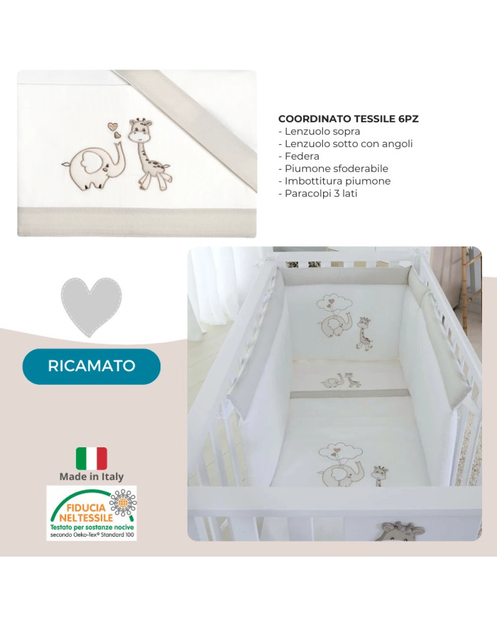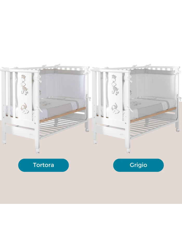 - Tessile ricamato lettino composto da: paracolpi, piumone sfoderabile, imbottitura piumone, lenzuolo sopra, lenzuolo sotto con angoli, federa