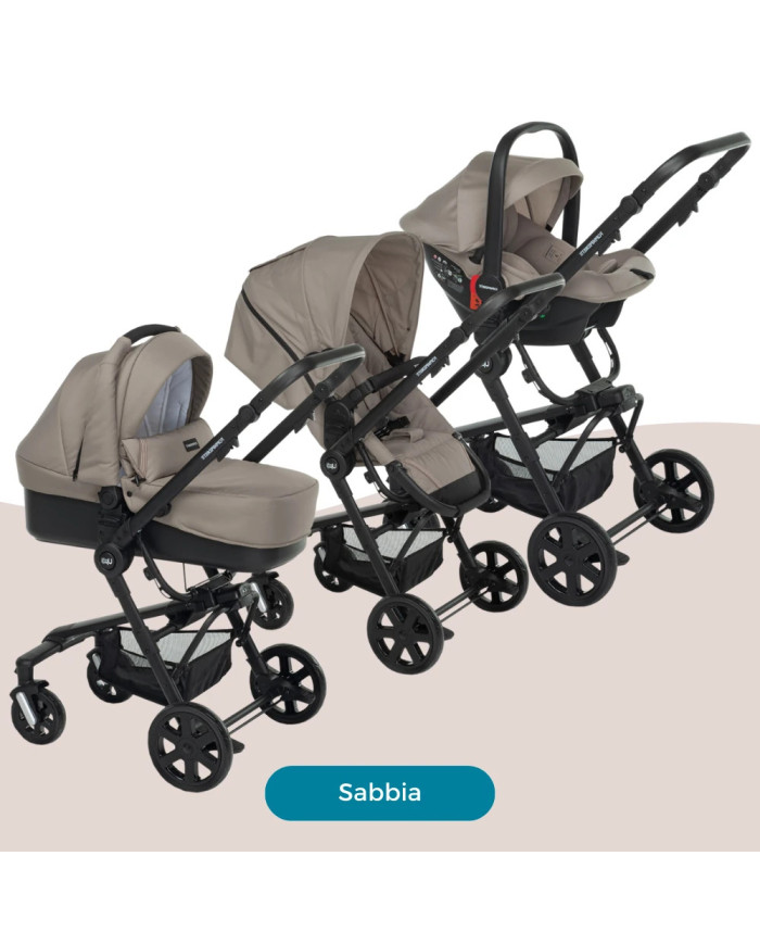 - Trio UP3 composto da: Telaio, Passeggino, Navicella con materassino, Ovetto auto, Capottina, Parapioggia, Cestino porta-oggetti, Coprigambe, Borsa con fasciatoio