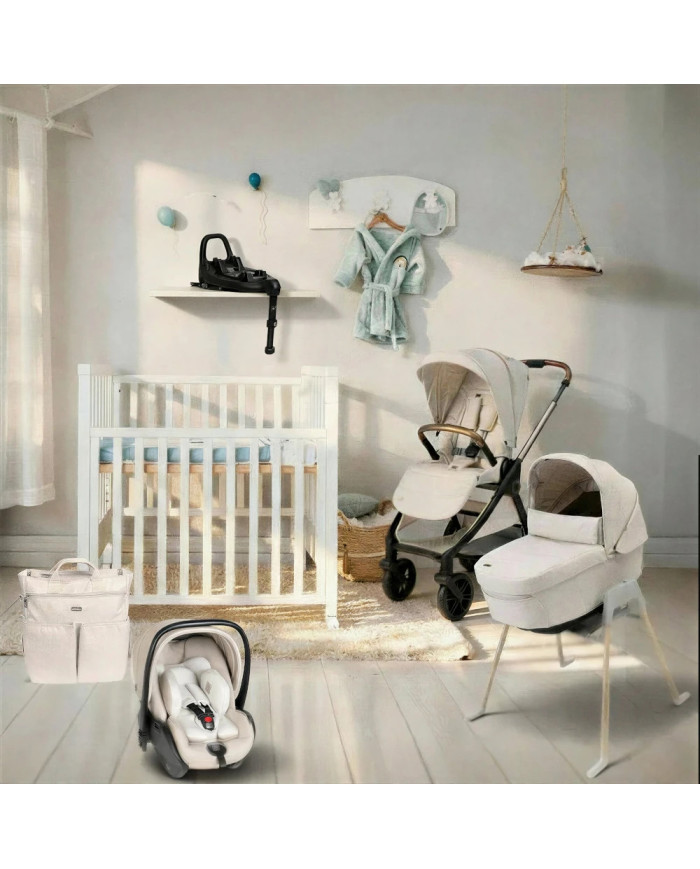Il Kit nascita completo include il Bellagio Travel Set Chicco: un pacchetto cameretta e trio che abbina passeggino, navicella Gran Comfort, ovetto reclinabile, base auto Full360 i-Size, Stand Lullaglide e Parent Bag coordinata, per una gestione pratica della vita quotidiana dentro e fuori casa.