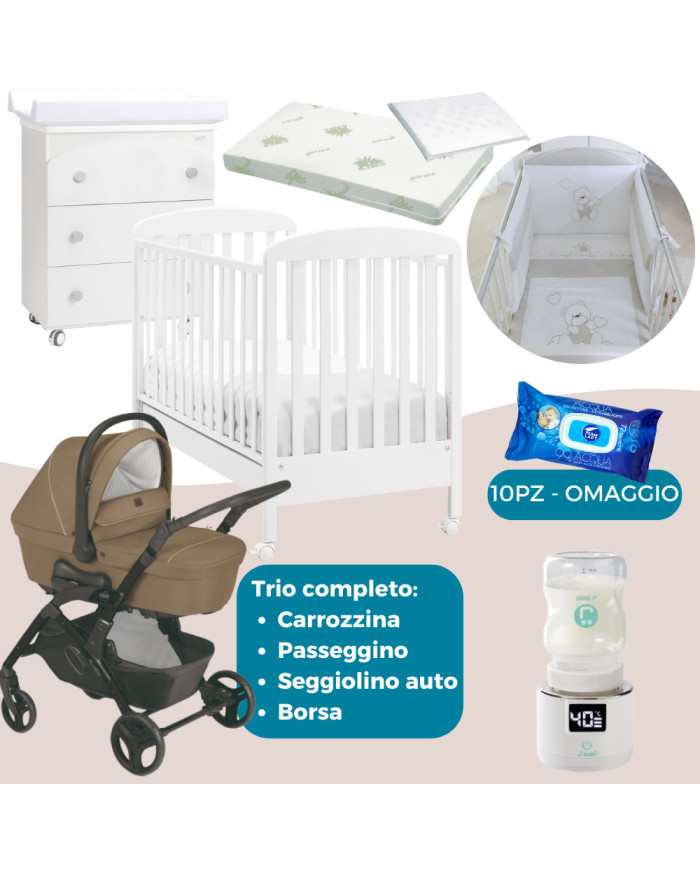 Kit Newborn, pensato per prepararvi all'arrivo del vostro bebè con il minor stress possibile, con Cameretta Basic + Set piumone 6pz Simpatico Coccolissimi, Trio Fluido Easy SE, Scaldabiberon portatile Warm-Up J-Bimbi e 10 Confezioni Salviette ipoallergeniche delicate per neonati a base d'acqua Piuma Lady (OMAGGIO).