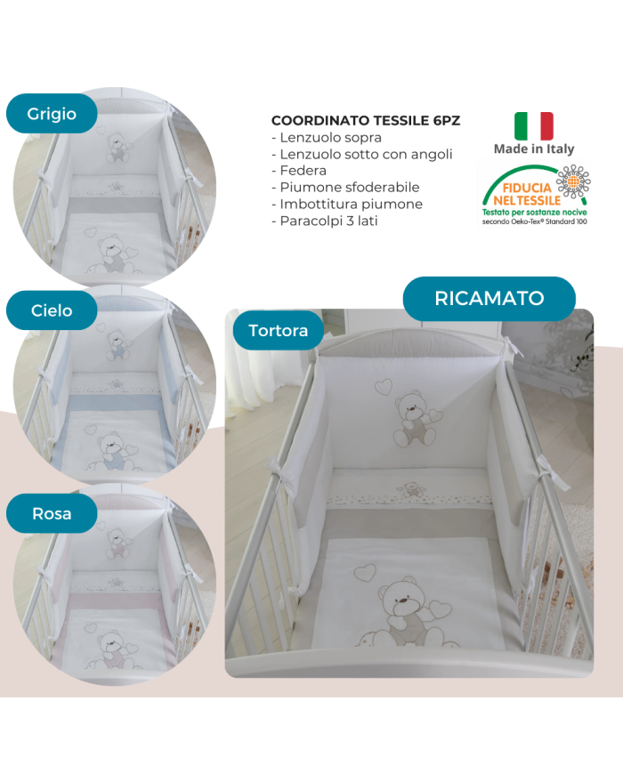 - Paracolpi + Piumino sfoderabile + imbottitura piumino + Set lenzuola 3pz (sopra ricamato, sotto con angoli e federa) per Lettino Simpatico Coccolissimi