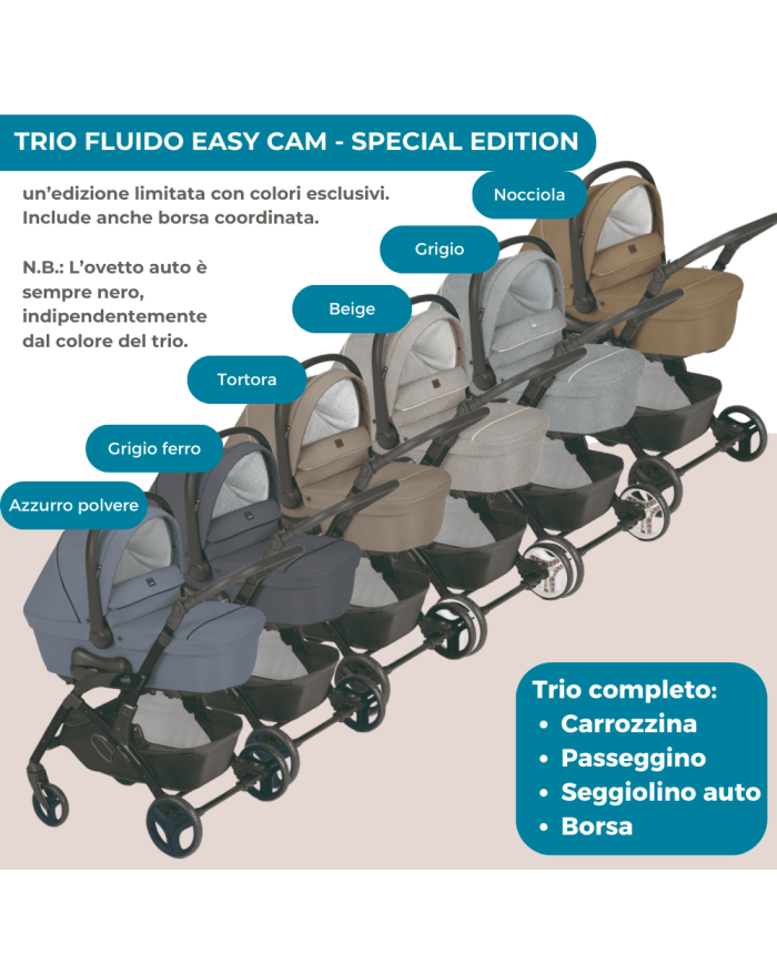 - Trio Fluido Easy SE Cam – Edizione Limitata composto da Passeggino, Navicella, Ovetto auto e Borsa con Fasciatoio