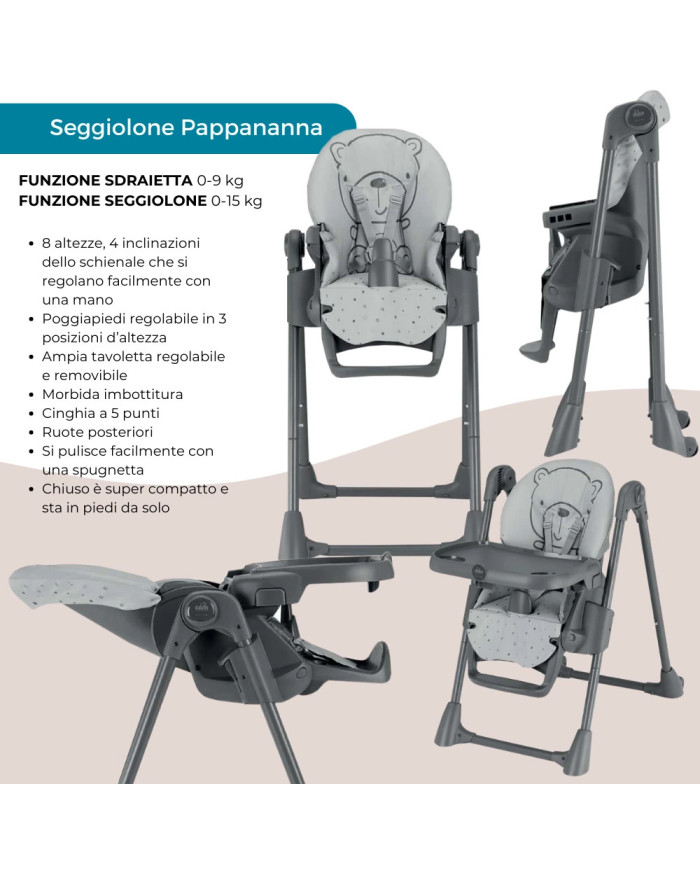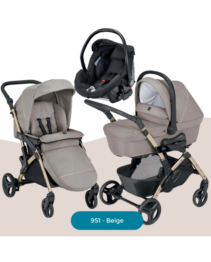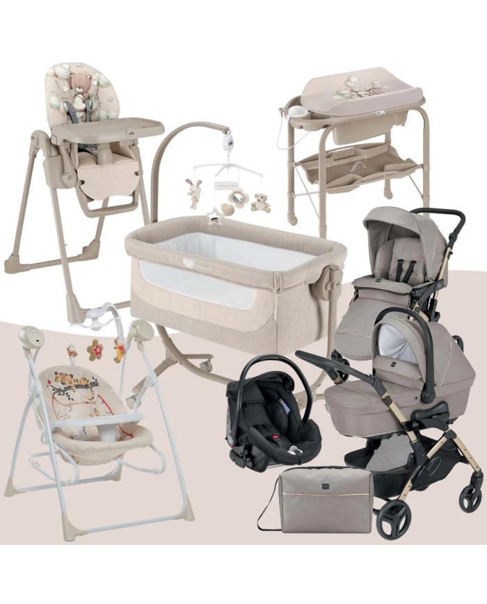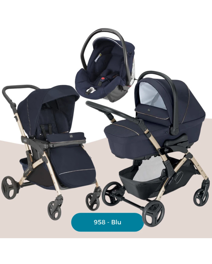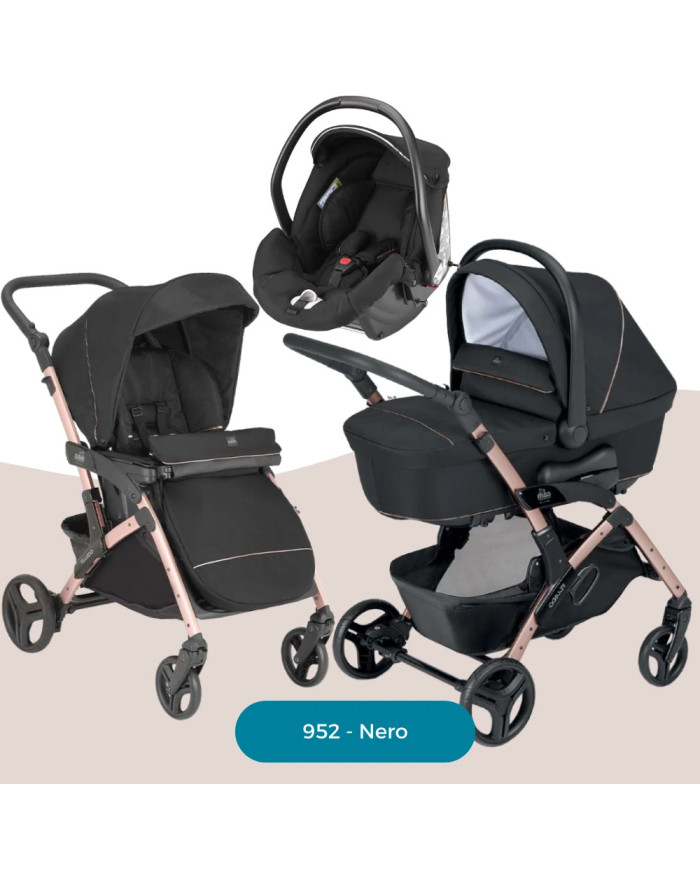 - Accessori inclusi: cappottina, copertina navicella che diventa coprigambe con passeggino, parapioggia, borsa fasciatoio
