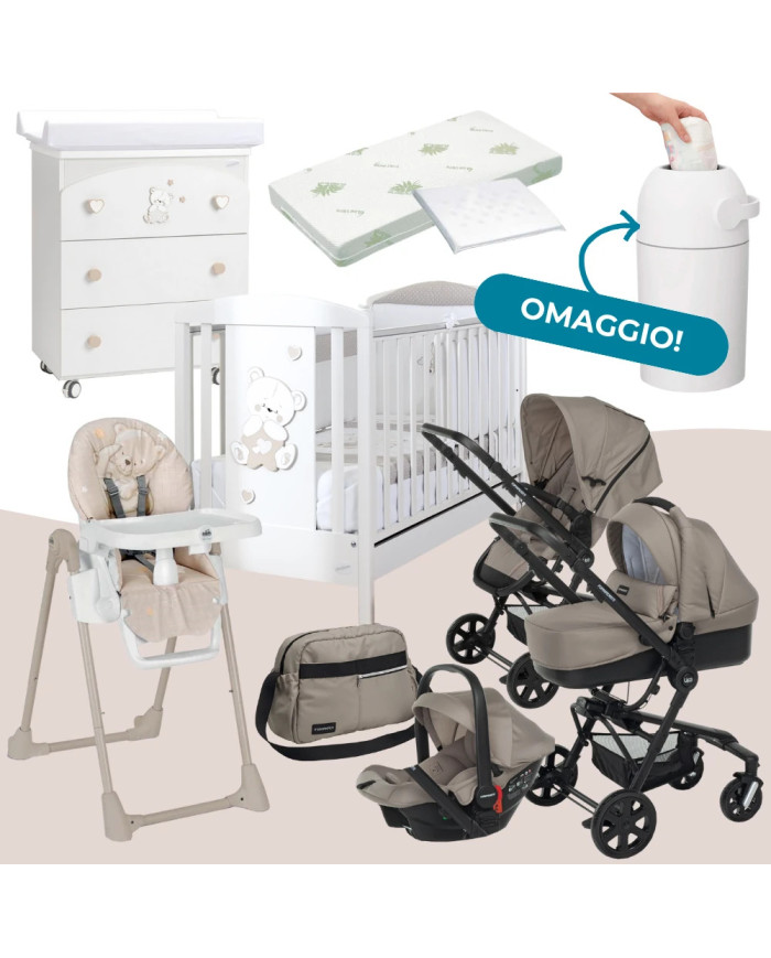 Questo Kit Supreme è la soluzione completa e conveniente per accogliere il tuo bambino nel mondo. Questo pacchetto esclusivo include tutto ciò di cui hai bisogno per i primi mesi del tuo piccolo: dalla cameretta completa al trio per le passeggiate, fino al pratico seggiolone per i pasti. E non finisce qui! In omaggio, ti regaliamo il mangiapannolini Chicco Odour-OFF, per gestire al meglio i cambi pannolino.