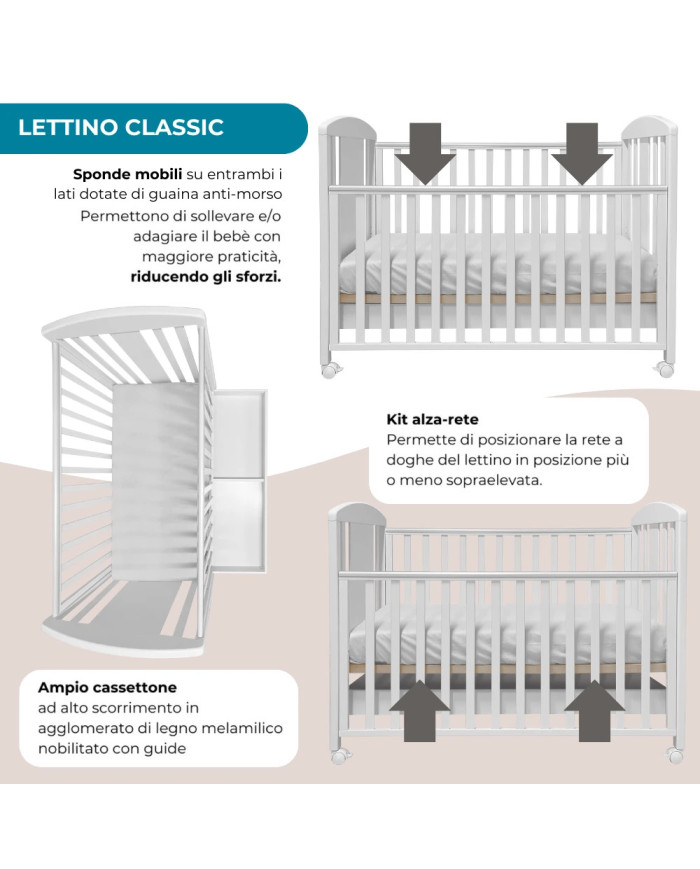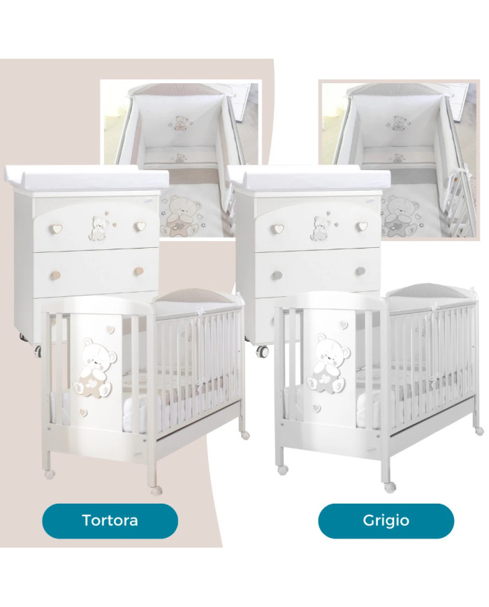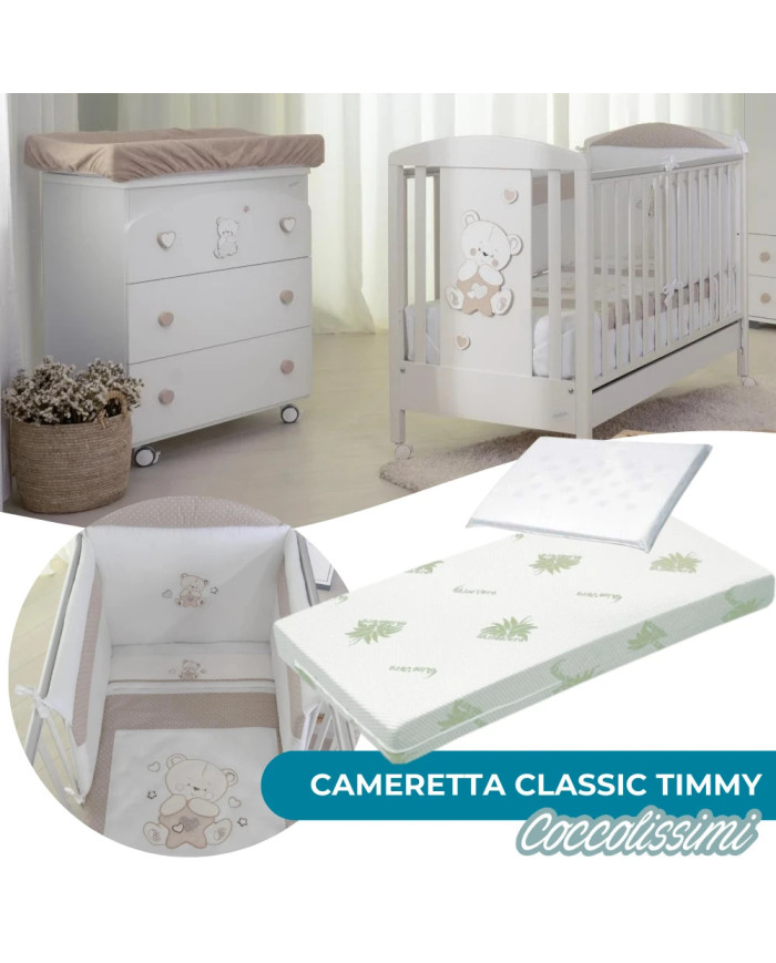 - Cameretta Classic Timmy Coccolissimi: Lettino, materasso, guanciale, corredino tessile ricamato, fasciatoio con materassino cambio e vaschetta bagnetto. Un nido sicuro e confortevole per il tuo bambino. Il lettino, con le sue sponde regolabili e il comodo cassettone, crescerà insieme a lui. Il materasso trattato con essenza di Aloe vera e il guanciale antisoffoco garantiscono un riposo sano e sereno. Il completo letto ricamato, con paracolpi e piumino, rende la cameretta ancora più accogliente. Il fasciatoio, con vaschetta estraibile e ampio piano d'appoggio, è perfetto per i cambi pannolino.