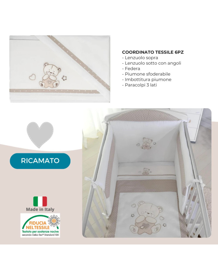 - Tessile completo per lettino (Paracolpi, piumone sfoderabile, lenzuolo sopra, lenzuolo sotto con angoli, federa)