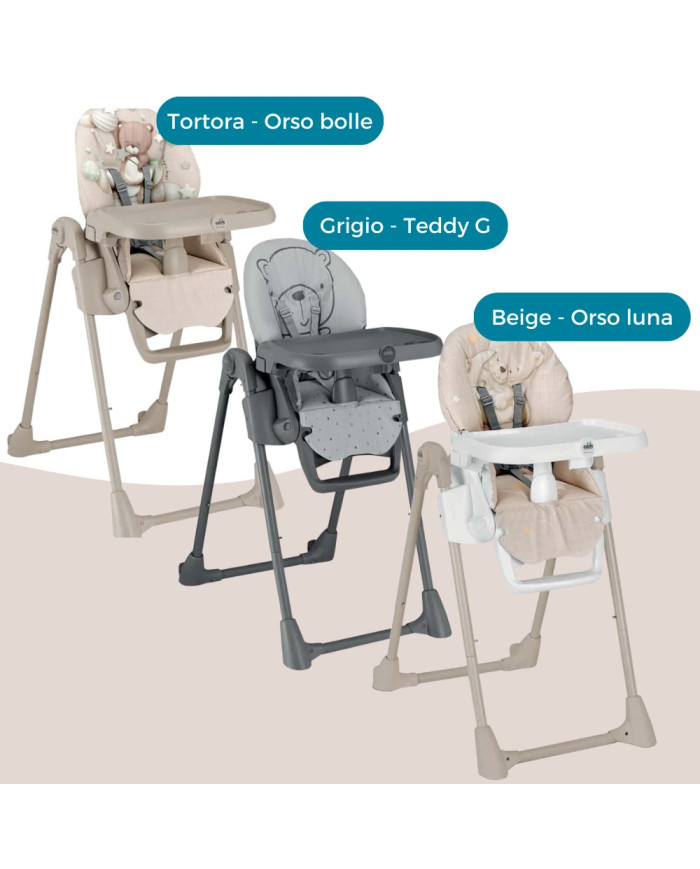 - Seggiolone Pappananna Cam: Un alleato indispensabile per i pasti. Regolabile in altezza e inclinazione, si adatta alla crescita del tuo bambino. La seduta imbottita e la tavoletta removibile garantiscono comfort e praticità.