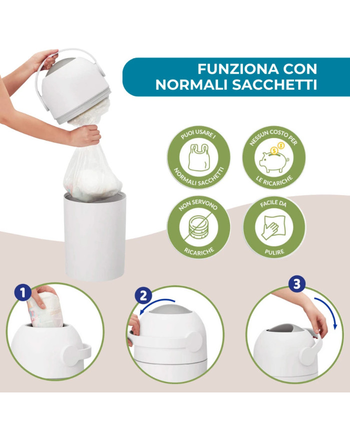 - Economico: Non necessita di ricariche, basta utilizzare i normali sacchetti per pannolini.