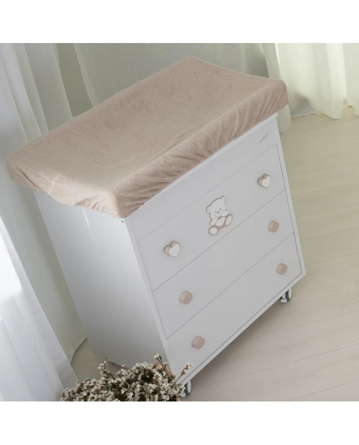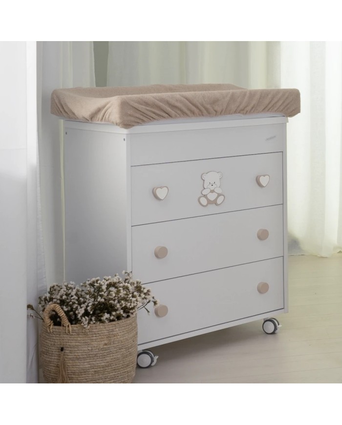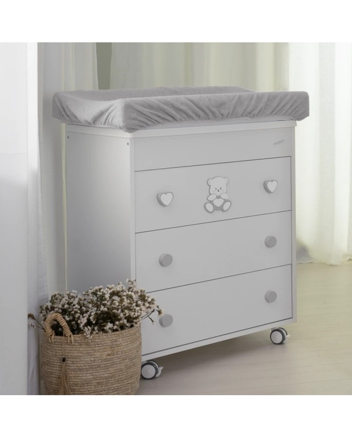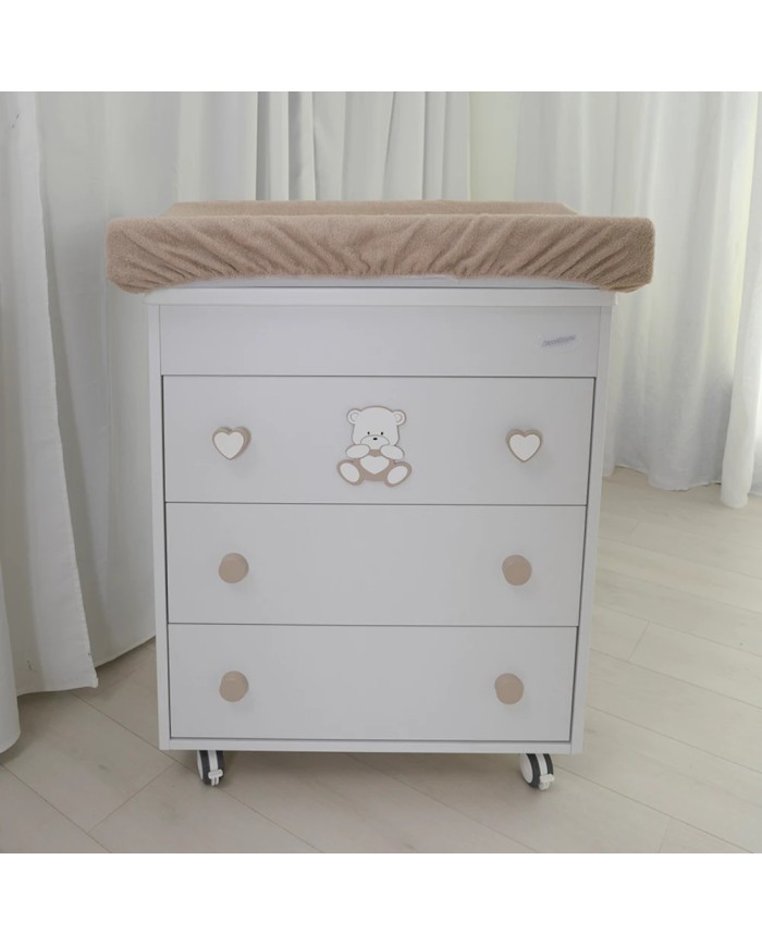 La cassettiera fasciatoio quadro Orso cuore di Coccolissimi è praticissima ma super elegante! Il design squadrato dei cassetti e gli adorabili fregi della collezione strizzano l'occhio all'ottimizzazione degli spazi. In un solo prodotto, infatti, ti permetterà di avere non solo una cassettiera capiente per contenere biancheria, abbigliamento e tanto altro, ma anche un fasciatoio con vaschetta per bagnetto estraibile all'occorrenza.