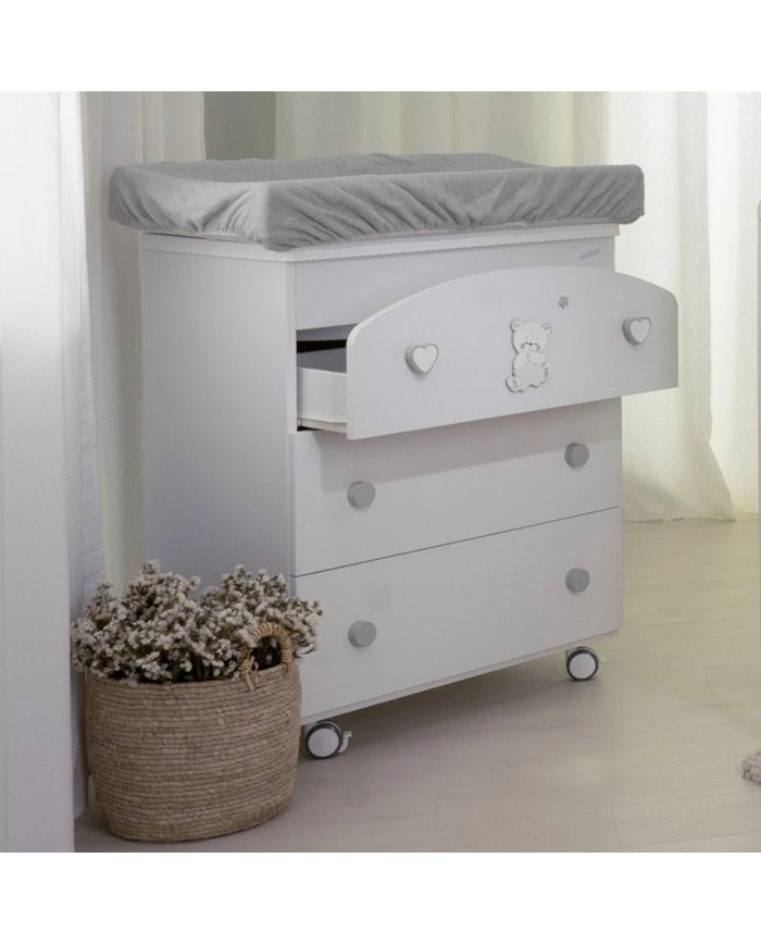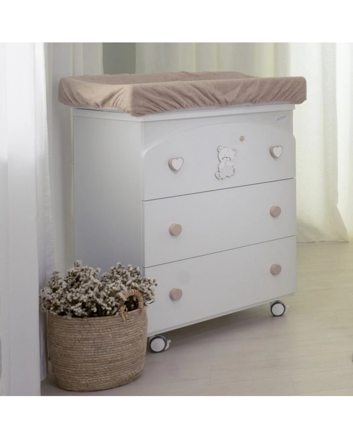 Il Fasciatoio Tondo 3 cassetti Timmy di Coccolissimi è praticissimo ma super elegante! Il design arrotondato del cassetto superiore e l'adorabile orsetto della collezione Timmy strizzano l'occhio all'ottimizzazione degli spazi. In un solo prodotto, infatti, ti permetterà di avere non solo una cassettiera capiente per contenere biancheria, abbigliamento e tanto altro, ma anche un fasciatoio con vaschetta per bagnetto estraibile all'occorrenza.