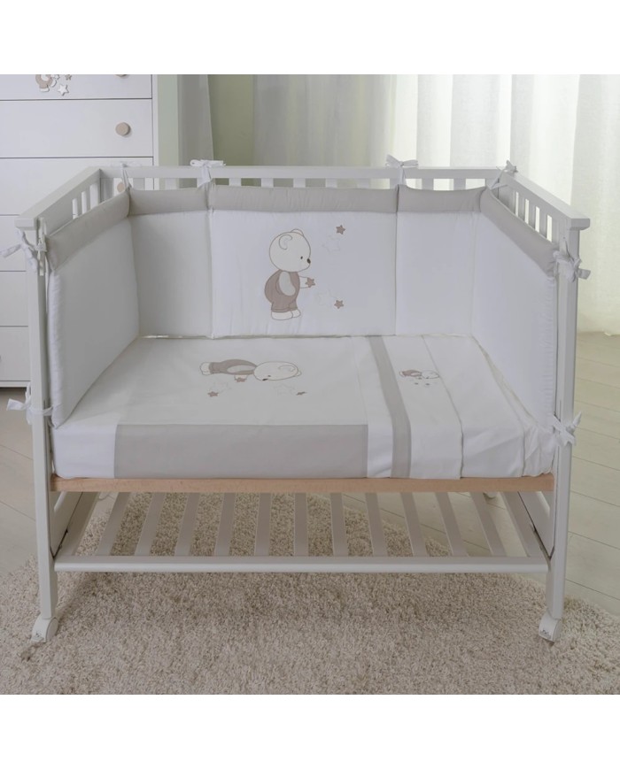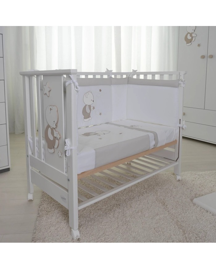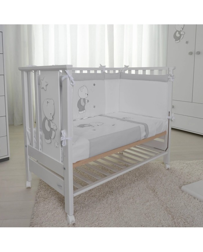 Il coordinato tessile completo per lettino Compact Cercatore di stelle di Coccolissimi sono la soluzione ideale per chi desidera praticità e qualità ad un prezzo vantaggioso. Acquistalo in abbinamento al lettino Compact fianco-letto della stessa collezione, per una cameretta dall’aspetto super elegante!