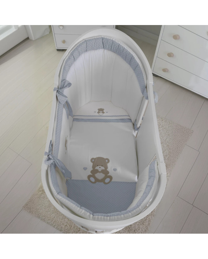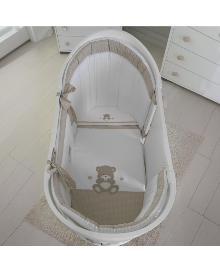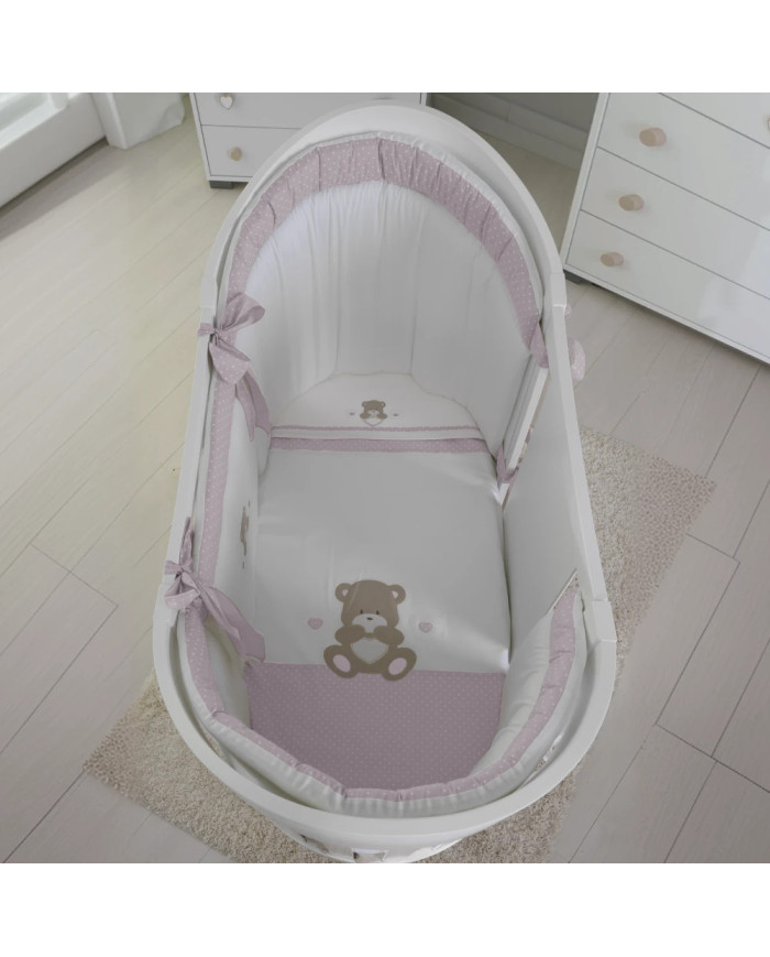 Il coordinato tessile completo per lettino Ovale Orso cuore di Coccolissimi è la soluzione ideale per chi desidera praticità e qualità ad un prezzo vantaggioso. Acquistalo in abbinamento al Lettino Ovale della stessa collezione, per una cameretta tutta in pendant!