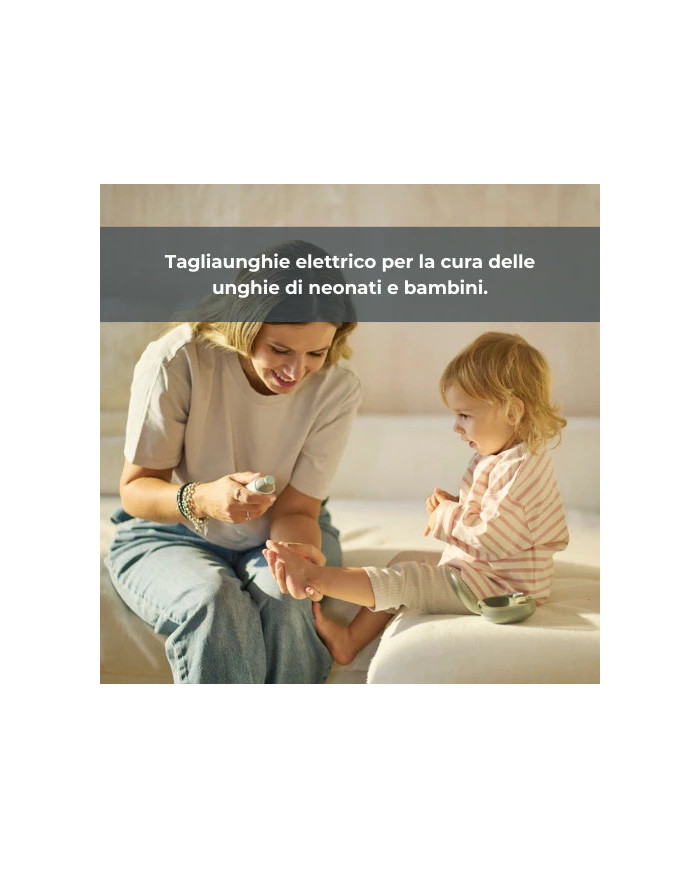 Il tagliaunghie e limaunghie elettrico Trimmy è pensato per la cura sicura e delicata delle unghie di neonati e bambini.