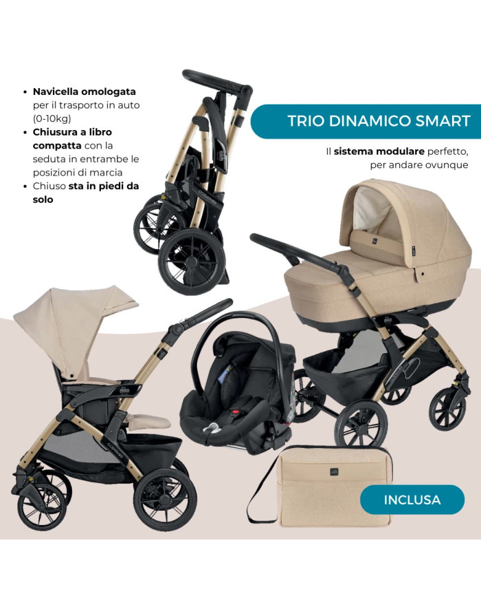 - Trio Dinamico Smart composto da: Telaio, Passeggino, Navicella con materassino, Ovetto auto, Capottina, Coprigambe, Cestino porta-oggetti, Borsa