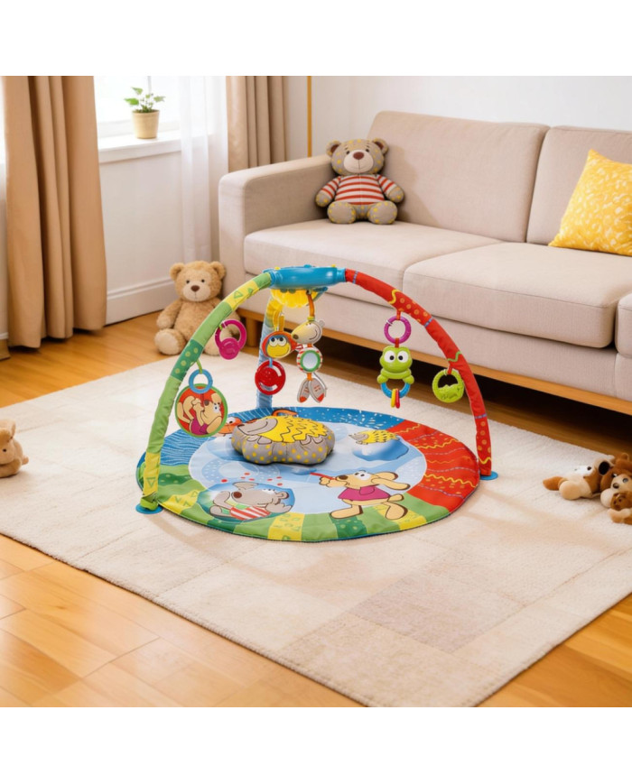 La Palestrina Bubble Gym Chicco crea un’area di gioco morbida e sicura grazie al tappeto trapuntato di grandi dimensioni e al soffice cuscino a forma di riccio, ideale per il supporto di collo e schiena.