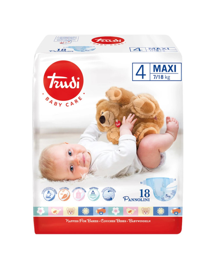I pannolini Trudi Baby Care sono progettati per offrire comfort, protezione e massima assorbenza grazie alle fasce laterali elastiche, al rivestimento traspirante "come cotone" e al materassino con cuscinetti 3D.