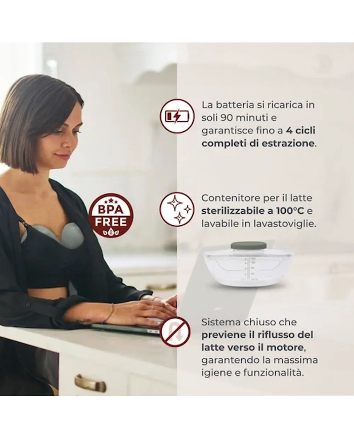 Silenzioso, utilizzabile anche in posizione semi-sdraiata, con coppa ergonomica in silicone BPA free, sistema chiuso anti-riflusso, batteria USB-C fino a 120 minuti, display touch e astuccio rigido incluso.