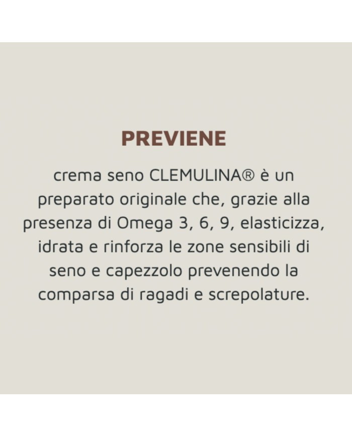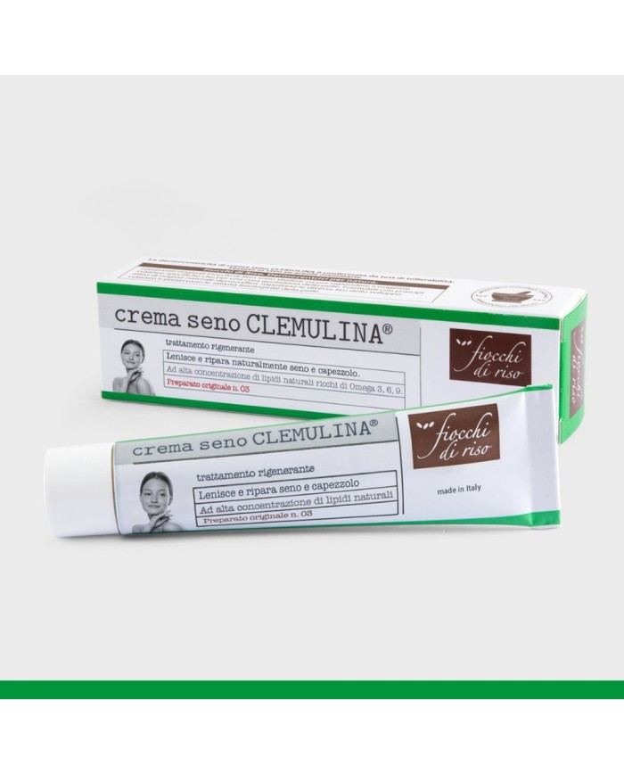 La Crema seno Clemulina Fiocchi di Riso è un trattamento rigenerante ad alta concentrazione di lipidi naturali, studiato per lenire e riparare seno e capezzolo, prevenendo la comparsa di ragadi durante la preparazione all’allattamento e l’allattamento