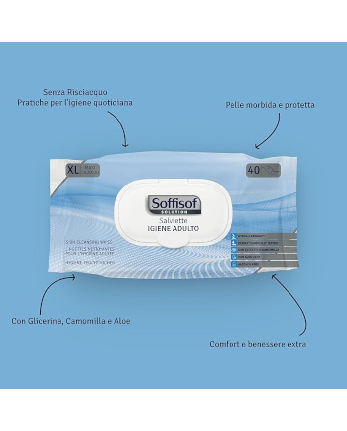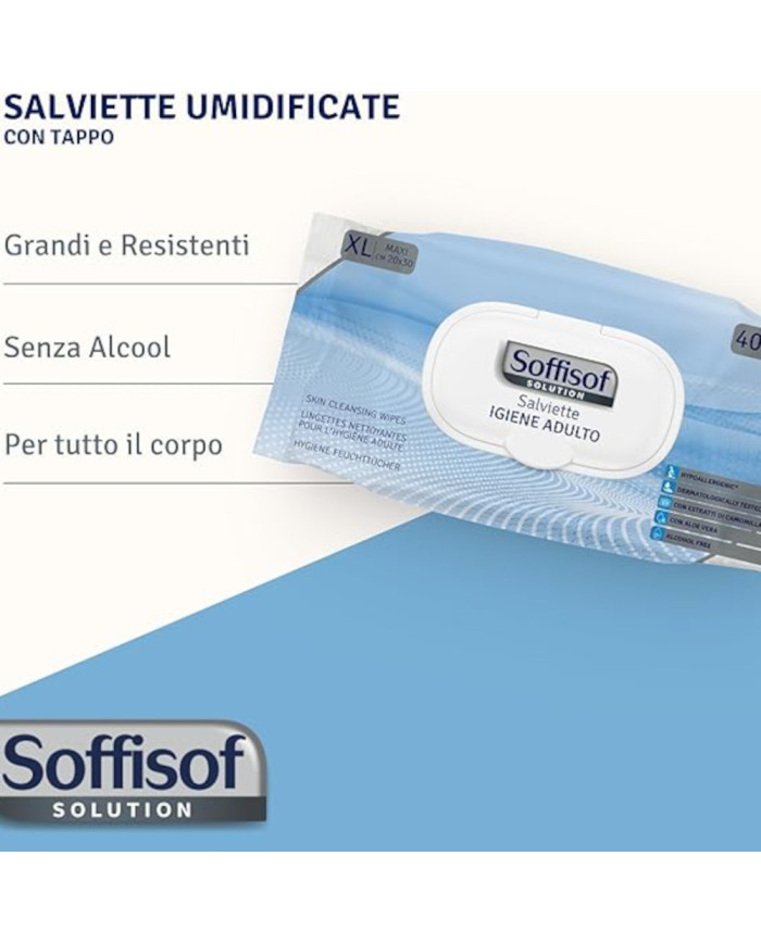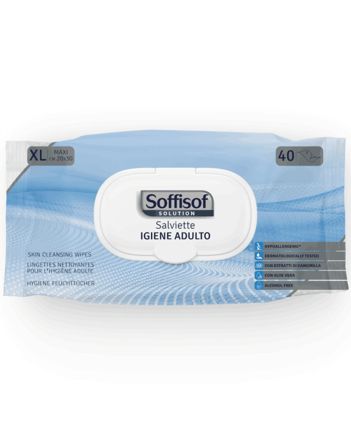 Le Salviette Umidificate per Adulti XL Soffisof offrono una pulizia completa e delicata grazie al formato extra large 20x30 cm. Ideali per anziani, persone allettate o con mobilità ridotta, garantiscono igiene e comfort senza bisogno di risciacquo. Possono essere riscaldate per un utilizzo ancora più piacevole.