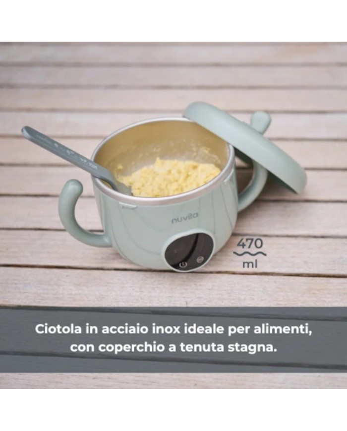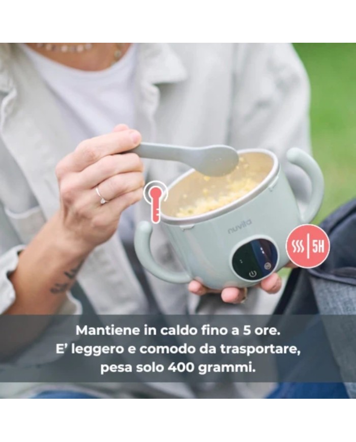 Il Kit Pappa and Go Nuvita include lo scaldapappa portatile Pappa’n’Go con batteria al litio ricaricabile e funzionamento anche a corrente. Dispone di 4 temperature selezionabili (40°C, 45°C, 50°C, 65°C) con mantenimento fino a 5 ore e funzione yogurt (43–46°C). Capacità 470 ml, peso 400 g. Interno in acciaio inox 316, impermeabile IPX7 e lavabile sotto acqua. Ideale da abbinare allo Scaldabiberon portatile universale Warm'n'Go di Nuvita.