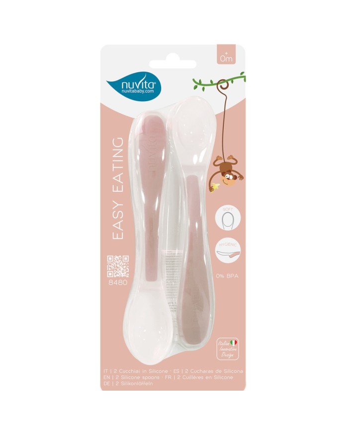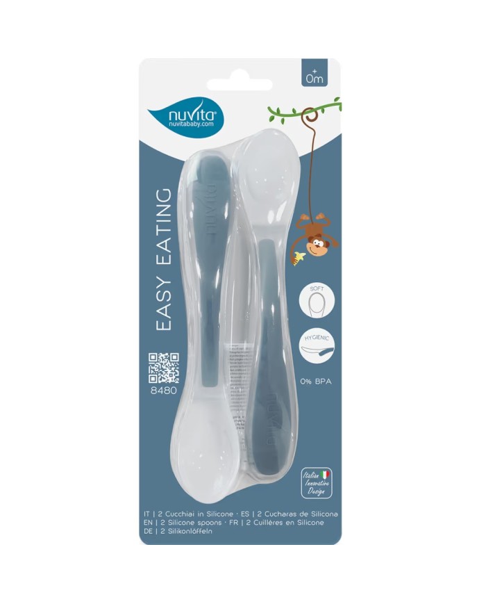 Il Kit Pappa and Go Nuvita comprende 2 cucchiai Easy Eating con punta morbida in silicone, delicata su gengive e dentini. Il supporto igienico evita il contatto diretto con il piano d'appoggio, mentre il manico ergonomico antiscivolo favorisce l’autonomia del bambino. .