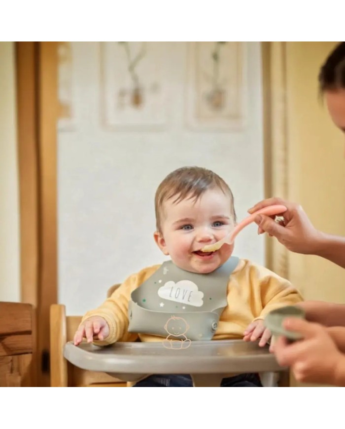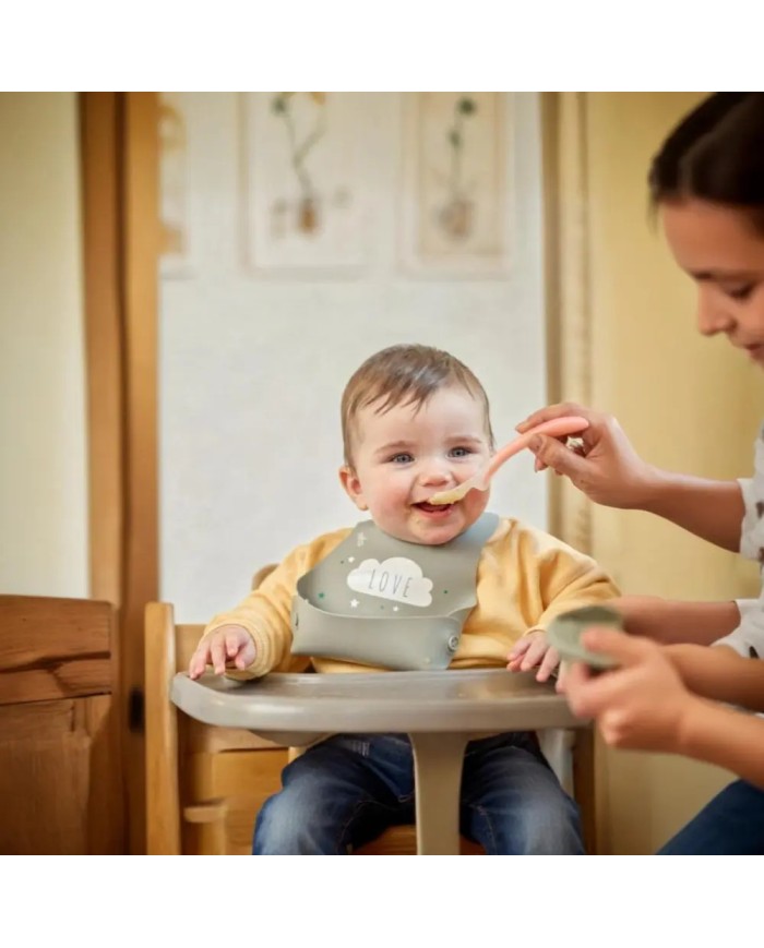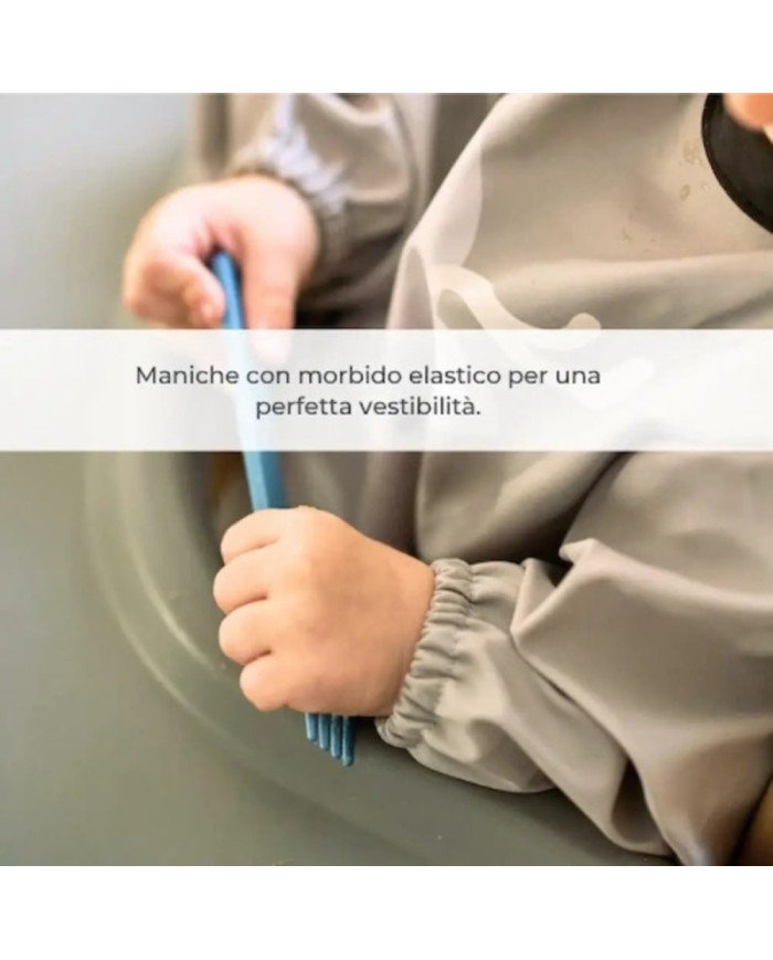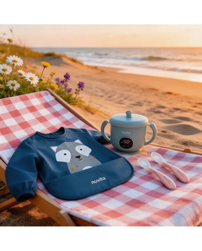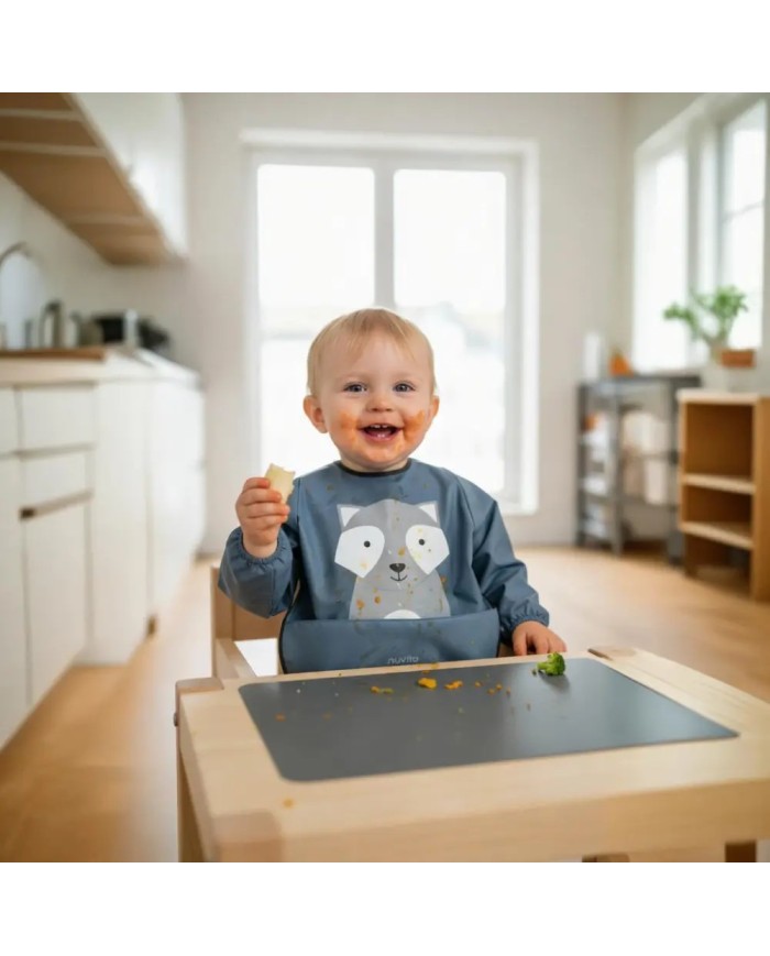 Il Kit Pappa and Go Nuvita include un bavaglino in tessuto rPET riciclato con laminatura in PU, impermeabile e traspirante, certificato OEKO-TEX®. Dotato di maniche lunghe con elastico e tasca raccogli-briciole, protegge vestiti e braccia durante i pasti e le attività creative. Lavabile in lavatrice e ad asciugatura rapida.