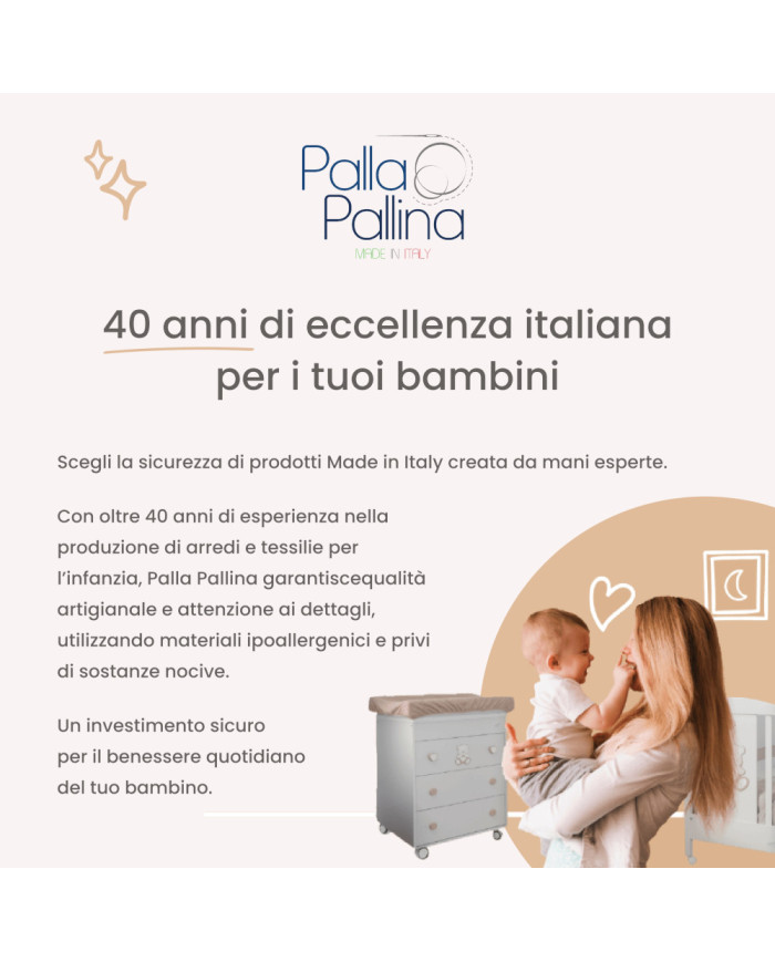 Il materassino fasciatoio Palla Pallina è la soluzione ideale per un cambio pannolino sicuro e confortevole. Dotato di sponde anticaduta, rivestimento in PVC impermeabile e imbottitura morbida, si adatta perfettamente alla cassettiera-fasciatoio. 100% Made in Italy e facile da pulire, garantisce igiene e tranquillità per ogni momento del cambio.