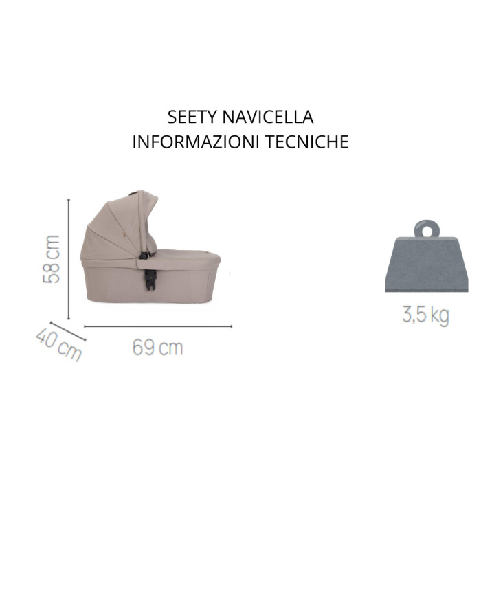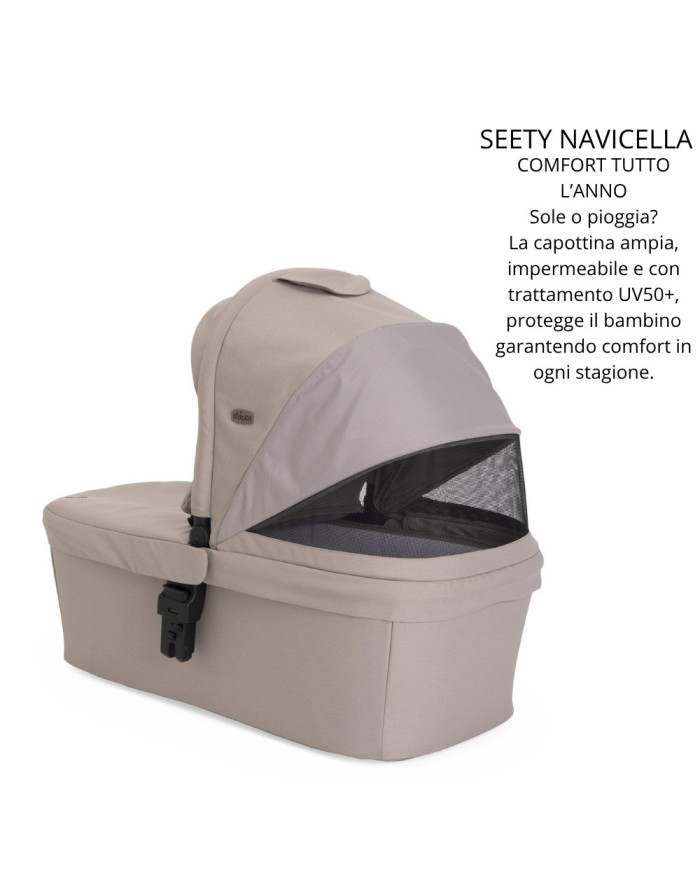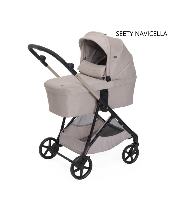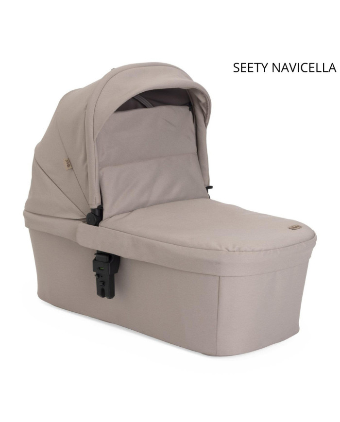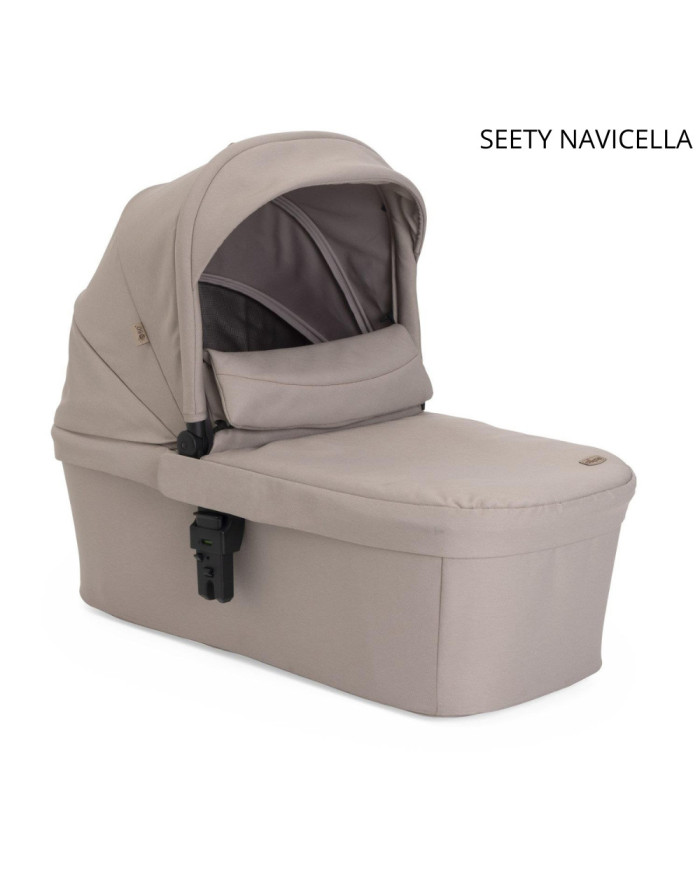 La navicella Seety accoglie il neonato in un morbido abbraccio. Leggera (solo 3,5 kg) e pieghevole, è dotata di maniglia integrata e aggancio diretto al telaio senza adattatori.