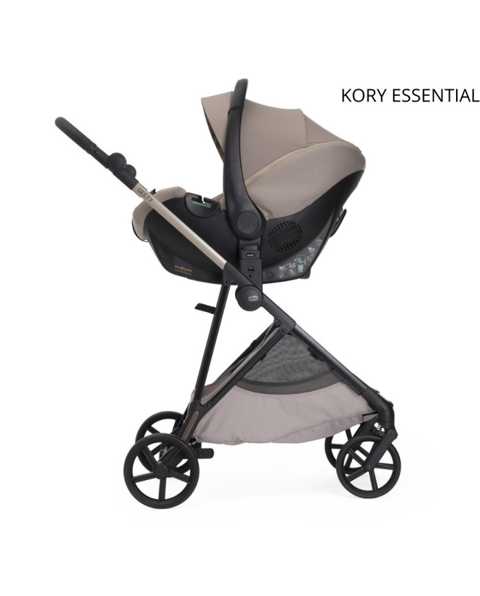 Composto da passeggino, navicella Seety e seggiolino auto Kory Essential, offre tutto ciò che serve per affrontare con serenità ogni momento della giornata, in casa e in viaggio.