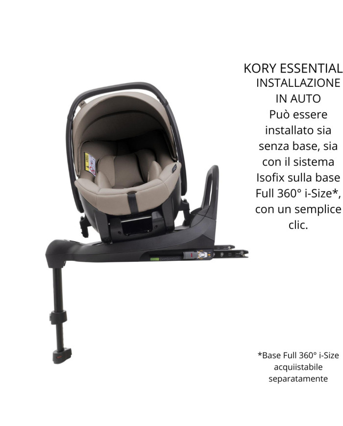 Sì, il seggiolino Kory Essential I-Size è completamente compatibile con la base auto Full 360° i-Size, acquistabile separatamente.