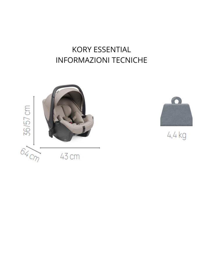 Il seggiolino auto Kory Essential I-Size è omologato secondo la normativa ECE R129/03 (40–80 cm, max 13 kg), garantendo protezione ottimale per i neonati.